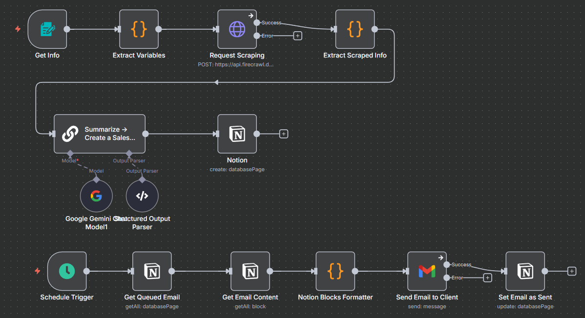 June 2025An automation workflow in n8n that connects various APIs: Firecrawl crawls the content of a website; Gemini generates draft email; Notion database for email content review, revision, and approval; Gmail triggers email sending of approved content.